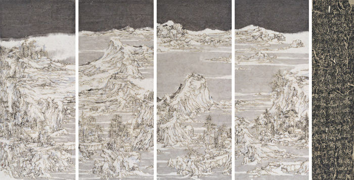 王天德,函关平雪图,173×72cm×4,173×40cm,宣纸、墨、火焰、石门铭拓片,2020