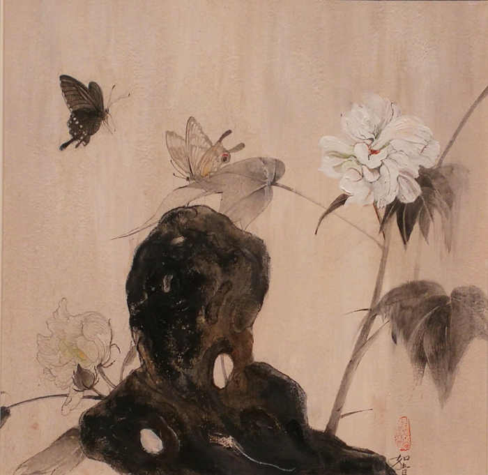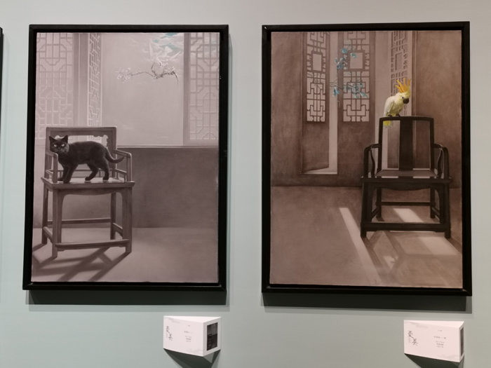 艺术家曹清从事南京博物院院藏古物研究,传统文化可以说刻在了她的骨子里。她的画作从传统中学习,又加入了当代的意趣。她观察一花一木,一石一景,连蝴蝶停在石头上与停在叶片上,对她而言都有着细微的变化。《窗口》系列中,她将日常生活中的场景以传统水墨画的方式描摹出来,无论是园内一角的竹石还是室内慵懒的猫咪,都有着特别的灵动与传神。此外,本次占拉美她还带来了两幅专门为致敬河北博物院而创作的作品《夏冀》系列,清疏而宁静的画面中,既呈现了传统气韵又有当代人的审美特征。
