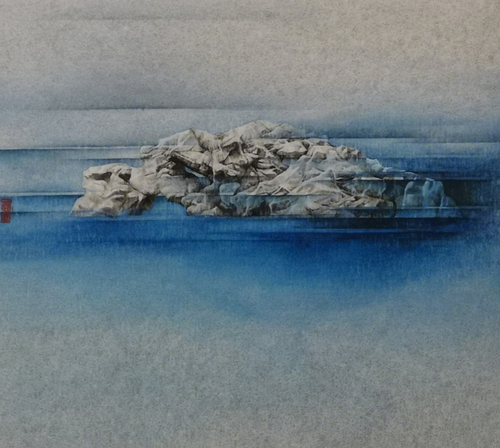 她的《水石图》系列中有三种元素,天空、水面与湖石。湖石与她儿时在江南的记忆有关,她年少时常和小伙伴一起在园林的假山石中穿梭纳凉游戏。这些江南园林中的假山石玲珑剔透又千姿百态,可谓是移步换景。宋代画家郭熙有言:“水以石为面、水得山而媚”。即画湖石,又怎离得开水。王文婕以变化莫测若有若无的着色,画出了似真似幻起伏不定的波纹。最近画得几张画中,湖石逐渐占据了画面的中心位置。艺术家说,在疫情期间家人在海外盼了很久才回来,再加上对无法靠岸的邮轮等一系列事件的关注,对生命有了新的感悟。
