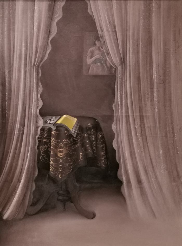 艺术家王文婕早期的作品中与江南园林的室内建筑有关,她特意布置场景再描绘下来,讲求画面的故事性与叙事性。如《在室内》中将杂志中的玛丽莲梦露与月份牌中的美人形象并置,产生一种跨越文化与时空的对话。