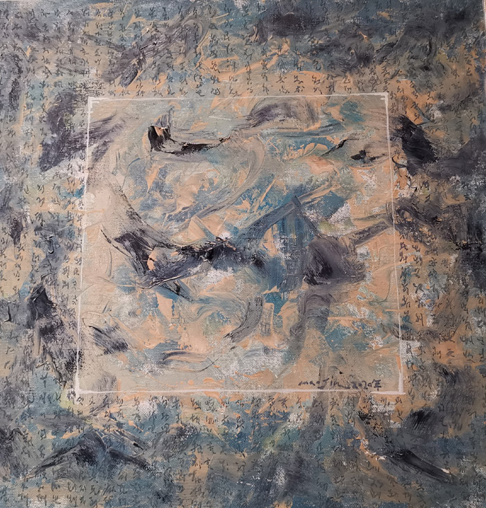 艺术家毛进早期作品从行走敦煌观看到的莫高窟石窟艺术中取材,《方》系列来自于莫高窟的藻井。她谈到:“最开始我到敦煌去看到壁画中哪怕是一棵很小的树,都无比灵动与高度概括,就很有冲动画下来。”她的这一系列作品历经从装饰性很强的图案到去除图案化与画面抽象画,逐渐回归精神与本质。《致敬》系列作品,融入了《方》系列的元素,将古人的经典画作等局部以拼贴的方式画在画中,其中的文字是无意义的不可辨识。她力求以道法自然的状态,以谦卑之心学习进而学习古人画作。作品散漫而劲致,有与古人的神游和对传统的致敬,也有对当代情感的剖析,个性挚纯。