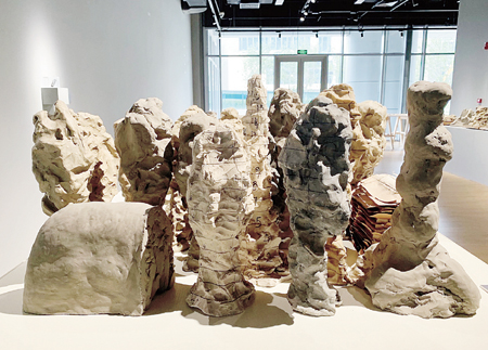 在同一个展出场的艺术家张羽,虽然参展的作品仍是著名的“指印”系列,但是2017年我们同去台湾东海大学所做的那次“指印——注入泥土中的肉身之迹”大展,却通过对泥的独特拿捏,实现了一种从“泥性”“水性”到“土性”的升华。艺术家所采取的乃是一种既不“雕”之也不“塑”之的方式,就是捏泥巴与按泥巴,一整块原泥既不增也不减,最终成型后既可以原本呈现,也可以烧成陶块现身,从而保持了雕塑之土坯状态的样貌,这就重新排列了土、泥和水在雕塑艺术当中的配方与方位。