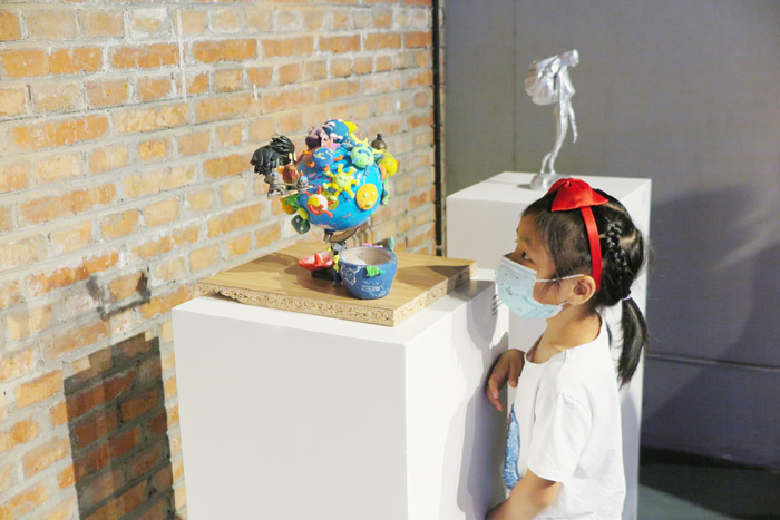 穿梭在偌大的展厅,不禁为小艺术家的创意和巧手点赞。他们关注疫情、致敬英雄,关注世界和平、地球环保,也有的反映学业生活,或是向最可爱的劳动人民致敬......他们选材广泛,贴近生活并学会废物利用——易拉罐、锡纸、木棒、石头、铅笔、废报纸......都在小艺术家的手下焕发出崭新的艺术面貌。那些稚嫩却敏锐的直觉,细腻而鲜活的情感倾注,甚至让成人都感叹自愧不如而羡慕不已,是他们的创意和真心打动了每一位评委和观者,也让人们更加反思艺术的力量。