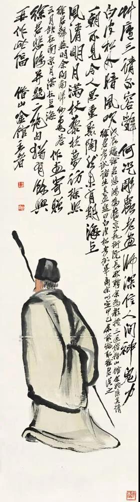 诗跋中将他创作《西城三怪图》的因缘都交待清楚了。北京画院也珍藏着一幅人物画,画中有一个戴暖帽、长袍,拽杖的老人背影。细看是白石翁的自画像,像上题了两首诗,诗后均有注释。其一曰: