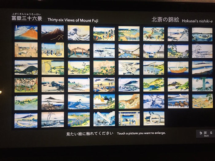 走进北斋美术馆,更多的北斋画作展现在眼前,意外的惊喜又被放大了不少。北斋原本创作的是一组版画,共计三十六幅,名为《富岳三十六景》。描绘的是从关东36个不同地点远眺富士山的景色(初版只绘36景,后追加10景),神奈川冲只是其中一处。