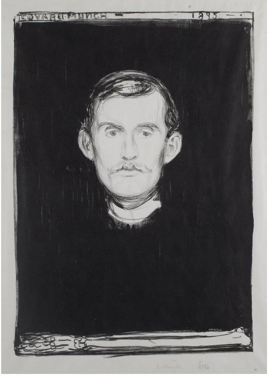 《有骷髅的自画像》1895,石版画