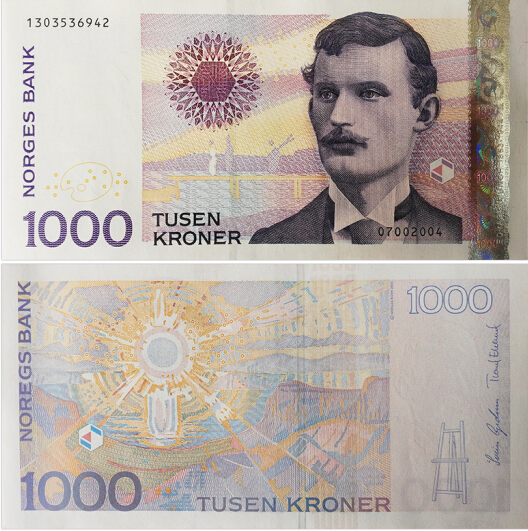 挪威纸币1000元面值,正面为爱德华·蒙克肖像及其作品《忧虑》局部,背面为其作品《太阳》