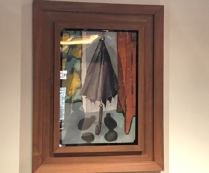 在此次展览中,朱金石出国前创作于1979年的作品《雨伞》尤为珍贵,它是朱金石还未与西方形成直接交流时的最初成果,也是他早期抽象艺术风格前的仅少见证。那批创作在上世纪70年代中期至80年代中期的作品,在自由的氛围中个性十足地显示了对绘画的初步看法,当然最后的展出结果也构成了与主流艺术对话的姿态。《雨伞》是整个展览中最早的一件作品,也是参加过在中国美术馆东面举行的“星星美展”的作品;无独有偶,此次作品竟也挂在北厅东墙上。画中雨伞滴落的水滴浸湿了地面,再日常不过的场景不仅反映了他那个时代里安静追求艺术的心境,对日常生活的观察也为朱金石之后几十年的创作添加了几分俏皮,称为智慧也不为过。