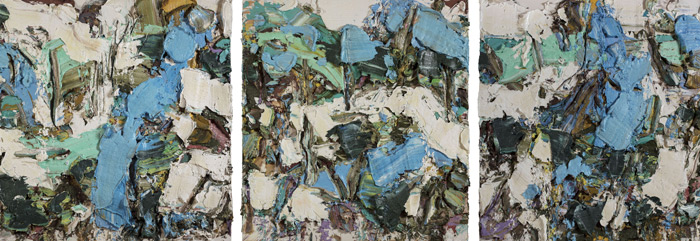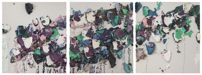 想就色彩问题给出高水平回答,更要对自己“狠”下心来。这一问题涉及到经年累月的视觉经验和日复一日的艺术实践。南厅中一幅2017年的三联大画《失去白云》,横竖涂抹很是淋漓,相比于北厅中同年所做的三联大画《初念》更显武气十足。作者微笑:前者的画面效果是在不断绘画的过程中出感性而为的;后者是有笃定想法后的一气呵成。两幅作品色彩如此艳丽,难以让人相信出自于耳顺之人;色彩系统中有明快的节奏,犹如歌曲,有律动,又时而彰显速度和力量;亦能感受到乐章,大调悠扬。中间色彩尤其令人着迷,丰富、细腻并带有偶发性。提到偶发性,大块颜料因地心引力掉落的偶然,也确实是创作之后的另一种偶发性。
