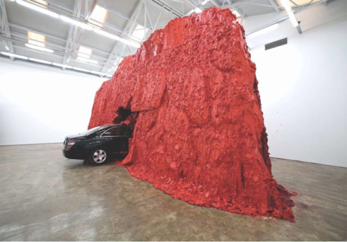 在朱金石的装置作品中,隐含着两股截然不同的力量,其一为主体性,多是体验性的表达;其二为客体性,带有强烈的对抗,涉及社会性质、文化碰撞、场域使用等。这两股力量都以浓郁的人为情感将深刻认知以“物”为载体进行视觉表达。在他心中,时而要借助生活的琐碎认清生活;时而要狠狠地干上一票,才算解了胸中闷气。正如艺术家本人所说:“我们无法预测今天的艺术,它需要在困境中寻找,需要每个艺术家的孤军奋战。”提到朱金石装置艺术作品的代表作,一定不能绕过2008年的《权利与江山》:一辆奔驰汽车撞向十吨红色油画颜料砌成的墙体。艺术家自己承认这件作品非常具有符号性,象征着一种文化,在那个与西方系统争取话语权的时期,这种冲突表现的的确“狠”到位。