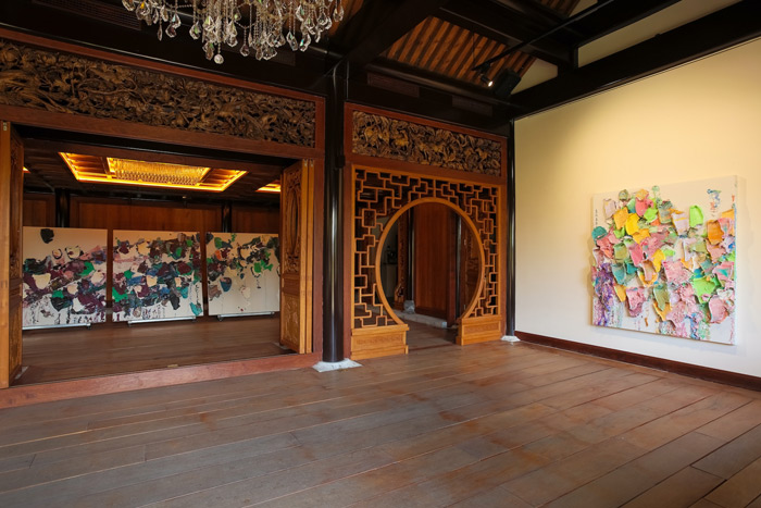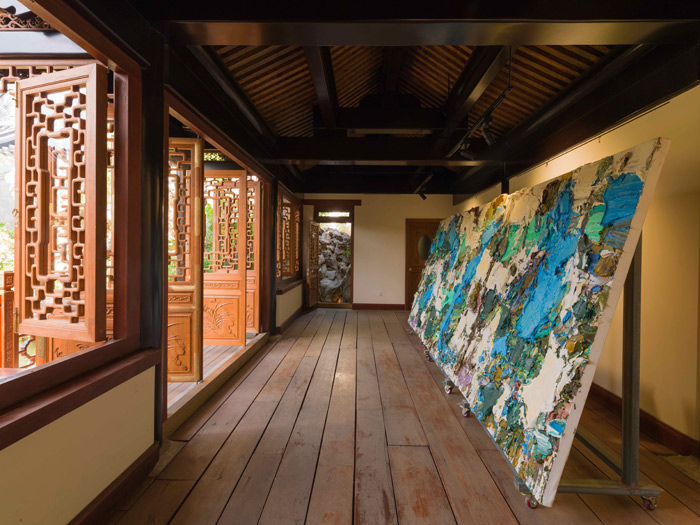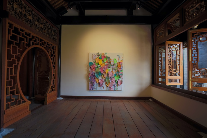 对于这样的一处别院,做展览并非易事,艺术作品极易沦为庭院点缀,必有非常之功的艺术作品方能不失风韵且相得益彰。此次“木·字”展,朱金石的作品俨然园中主角,两幅色彩丰富的“厚绘画”大作品仿佛花旦立于南北两厅,令别院有余音绕梁。不同于之前展览中艺术家多选取某一阶段作品展出,朱金石将自己40年的创作历程徐徐展开,每件作品都可圈可点,更可以点带面,纵可上述到每条创作主线,以不同时间段的观念变化为经;横可跨越国别语境,以国际当代艺术交往为纬。