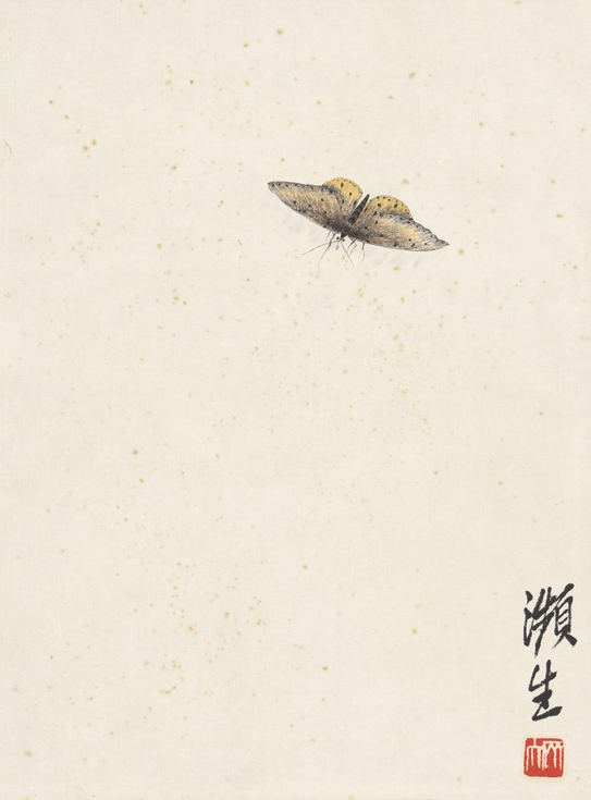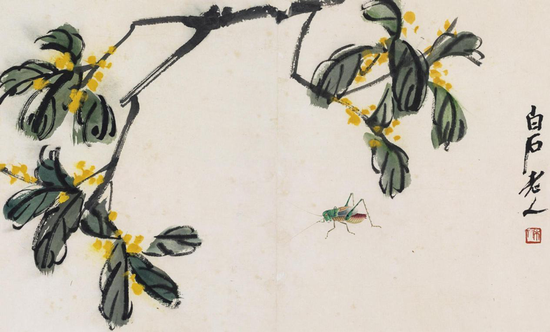 这幅虫草图在齐白石“衰年变法”的画作中,以桂花为题材的作品并不多见。金桂飘香,蝈蝈游离花枝下,层侧分明,视觉舒朗。尤其画中蝈蝈,由齐白石独创的干笔法画出,筋骨可见,既形象又神似。齐白石寓情于景,笔笔写出,无不体现其独运匠心,堪称文人画“逸品”。此外,齐白石的花卉草虫是一丝不苟的,尤其草虫,洋溢着自然界生机勃勃的气息,尤其在刻画完美却未完成的图稿中,那些没有添景的空白部分可以引发人们的多种想象。齐白石在小小的方尺之间绘制了蝴蝶,蝴蝶的翅膀画得蓬松通透,可以想象,它的周围是一个甜蜜的世界。其实,齐白石在60岁之后陆续画了一批工笔草虫待以后补景,通常会将之与阔笔大写意花卉合于一图,防止老年时不能作工细的草虫。其中,除了此幅蝴蝶,还有一幅蝈蝈也未做写意花卉,均乃是齐家留存下来,为后代子弟学习绘画的资料所用,其价值尤为珍贵。