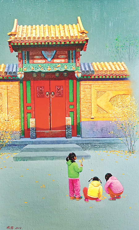 张国宁的作品“胡同四季”系列入选“胡同风韵”板块。张国宁是土生土长的北京人,从小生活在西黄城根儿南街的胡同里。成年后虽早已搬离胡同,但属于张国宁的胡同记忆却越发深刻。从1993年起,他每年在不同的季节都要去胡同里走一走。他转遍每个大街小巷,用相机搜集胡同资料,丰富创作素材,专注画胡同题材的作品已有近30个年头。他注重刻画胡同的每一个细节,门楼上古意盎然的砖雕、门板上寄情抒怀的楹联、门墩上细致精美的雕刻都是他描绘的对象。“每张画我都要精雕细琢,因为它们实在太美了。感觉我在雕琢岁月,岁月也同时雕琢着我。 ”张国宁说。同时,他注重表现胡同的人文主题,尤其喜欢描绘胡同童年。画面中那些玩耍欢笑的儿童有他童年生活的影子,也是他心中的“理想世界” 。他将童年记忆与收集的胡同资料融合为创作素材,用浓墨重彩记录下胡同的四季流年。