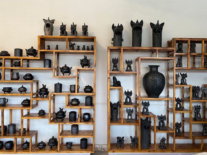 现代黑陶制作的基础离不开“采踩”二字。采——采取甸南当地陶土,静置暴晒一年以上方可制作使用。踩,顾名思义,便是制陶人光脚和泥,反复踩踏陶泥,挤压出空气,使泥块变得细腻稠黏,这是烧制优质黑陶的基础。踩好的泥土经粉筛过滤捏成瓦猫泥胚,而后入窑烧制72小时,冷却方可出炉。另外,大理不同地区的瓦猫工艺颇为相近,多采用一片成型的烧制工艺。