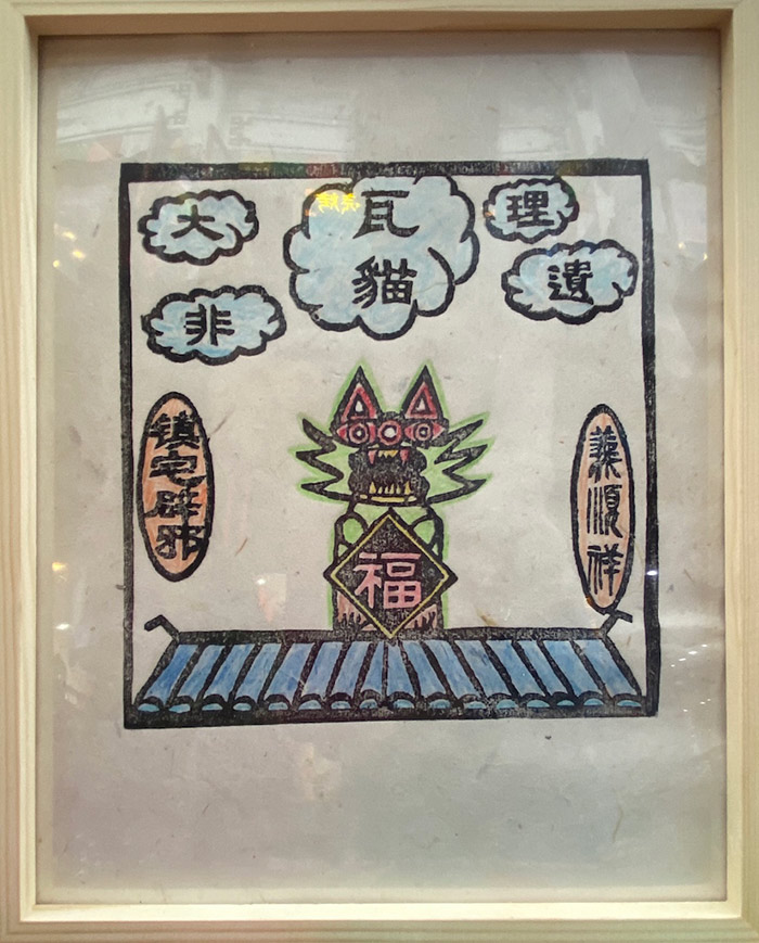 昆明呈贡的黄泥瓦猫最具特色,可以说它保留了最多老虎的特征。一些瓦猫身涂红漆,四肢站立于瓦上,长长的尾巴盘向右腿前,背部有龙刺状,身为鳞纹,一张血盆大口,口内牙齿竖直,头圆耳长,眼大而外凸,头顶漆“王”字,胸前扶抱的八卦太极图,虎视眈眈望着前方,颇有秒杀一切的凶狠魄力。这种面目狰狞的瓦猫成功继承了它们最原始的功用——驱邪镇宅,也极易区别于其它地区的瓦猫形象。