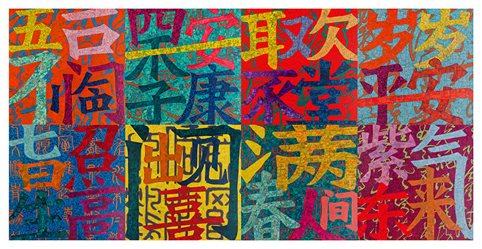 在高达九米的展厅中完美呈现的巨幅作品——《龙图腾》无疑是此次展览的最大亮点。“龙”形从发现最早的商朝拓印纹样衍生而出,由以100件代表100个姓氏的小尺幅绘画组成。本次策展人梁勤表示,“龙是中国炎黄子孙的代表,百家姓又是中国人的泛指,通过100张作品进行呈现是很特殊的方式。”