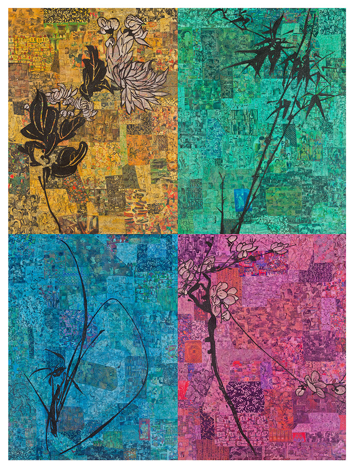 中国历史上以梅兰竹菊作为创作素材并不少见,薛松此次也选择清代木版年画上的梅兰竹菊,以灰烬、拼接进行了焕然一新的创作,是“中国DNA”最典型的部分。