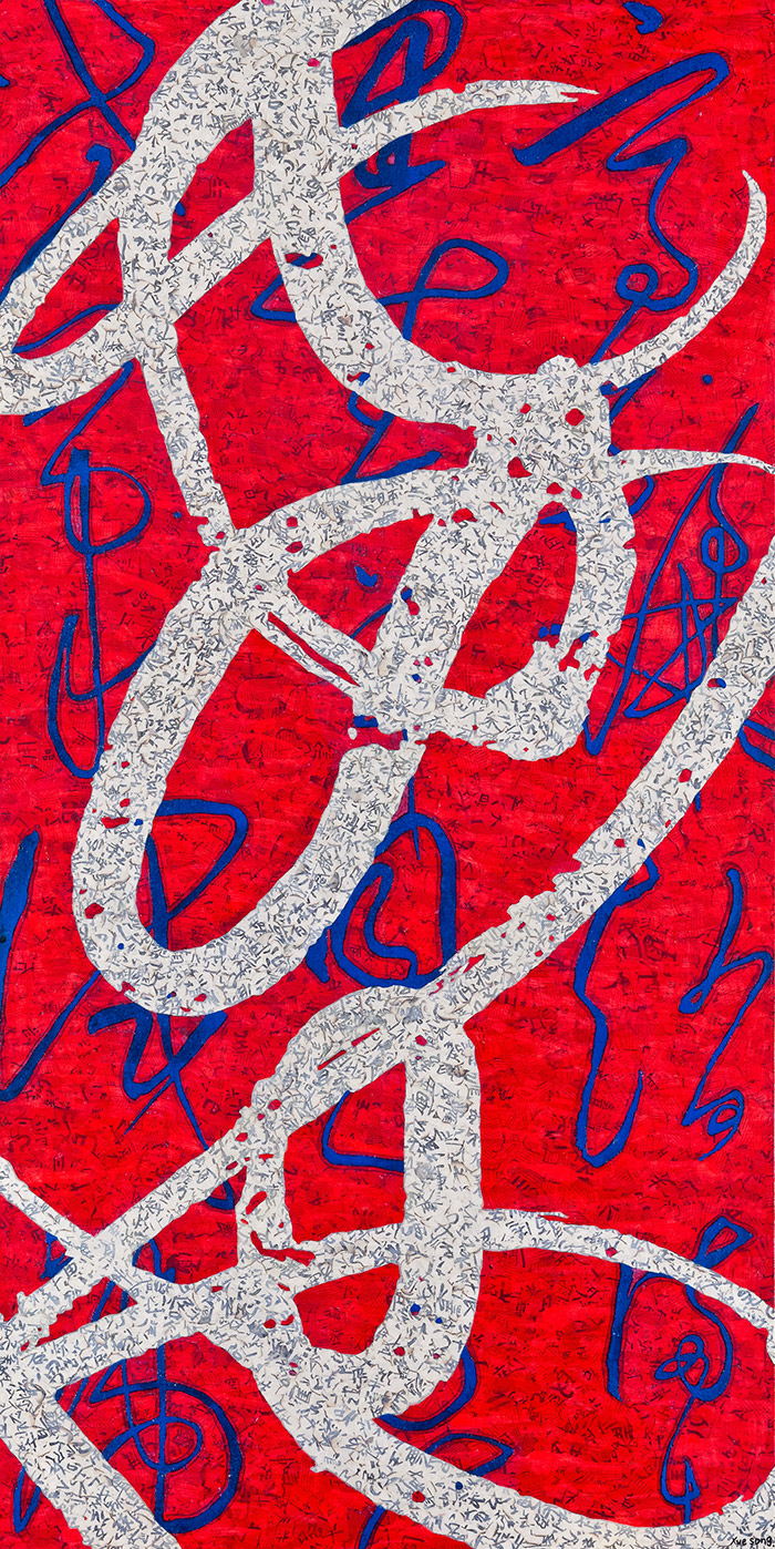 1990年一场大火,烧毁了薛松身边一切原有图像和形态,却推开了一扇全新的艺术大门。从毁灭到重生,就像一个轮回。艺术家将现成的图片、文本燃烧后,解构、建构再重组于画布上,它从原有的意义中被释放出来,被赋予新的理解,将东方与西方、历史记忆与当下现实、传统文化与现代观点链接起来,形成独有的薛松式风格。