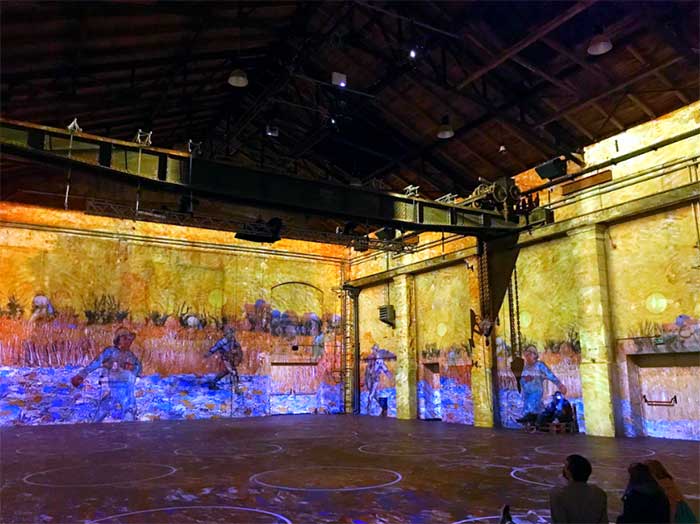 整个“梵高光影艺术展”是一个约35分钟的沉浸式艺术装置,策展人在梵高一生中的两千余幅画作中,精选出关键节点的标志性画作,通过十个部分娓娓道来梵高在尼嫩、阿尔勒、巴黎、圣雷米、奥维尔小镇的过往。在两个篮球场大小的展厅内,24台激光投影仪将耳熟能详的经典作品以超大尺寸、极高的分辨率投影呈现,从天花板到墙面、甚至观众席地而坐的大厅地面,都成了承载天才艺术的“画布”,精心编排的音乐更为视觉体验锦上添花。