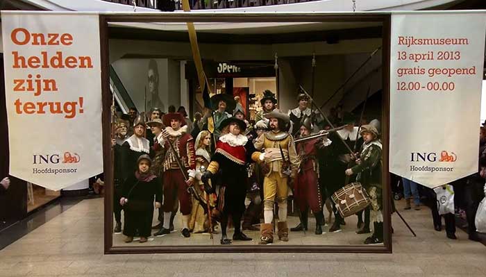 几年前,为了宣传展馆重新开幕,荷兰国立博物馆曾搞过一次镇馆之作《夜巡》的艺术“快闪”活动。试想一下这个情境,你正在首都阿姆斯特丹人潮涌动的购物商场中逛着街,忽然商场的警报器铃声大作,细听之下觉得不对劲:“这铃声怎么听起来不太现代?”不耳熟很正常,因为被敲响的是17世纪的铃声。还没等你反应过味儿来,身穿真正古着服装的“民兵队”开始四处抓捕“嫌犯”,又是绳子垂降、又是列队前行,一通操作猛如虎后,“嫌犯”终于落网。最后,所有人聚于商场中庭大合影,当他们摆出熟悉的站位和姿势时,你终于恍然大悟,这群人竟然是荷兰国宝画家伦勃朗名作中的夜巡队“复活”了!伟大的《夜巡》就这样被心思巧妙地重生,视频通过互联网传遍四海,看者皆会心一笑。