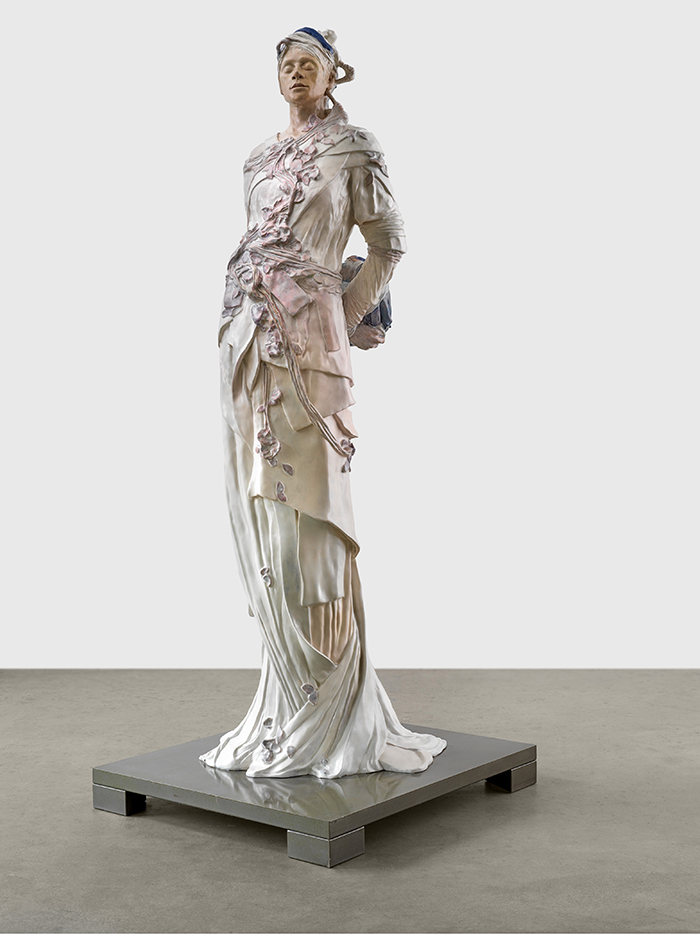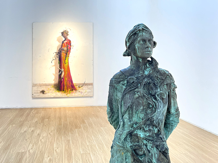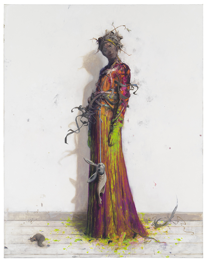 展览囊括了伯格特各种绘画和雕塑作品,艺术家在其中构建出充满了难以捉摸的人物形象、有如仙境般生动的另类维度。“暗线”是乔纳斯·伯格特最新创作的作品系列。作品《暗线》展示了一个污浊的房间,其中充满了明暗相间的模糊物体。它所描绘的人物身着各种颜色的皱褶服饰和紫色、绿色的植物状叶子,胸前和头部饰有柔和、飘动的色带和彩色的几何图形,展现了伯格特作品中经常出现的神话和神秘元素。人物被放置在画面的中央,并向画面之外的观众投以直视。背景显得毫无生气,除了绿色在其中跃动。如果认真观看这幅绘画,就会感觉像是进入一个新的世界,它的文化和时间向我们敞开,让我们希冀去进一步探索乔纳斯·伯格特个人内部的缤纷宇宙。