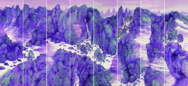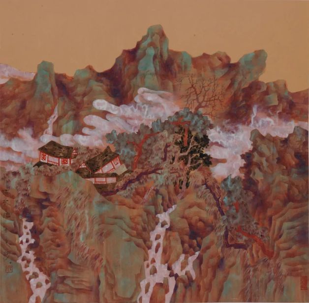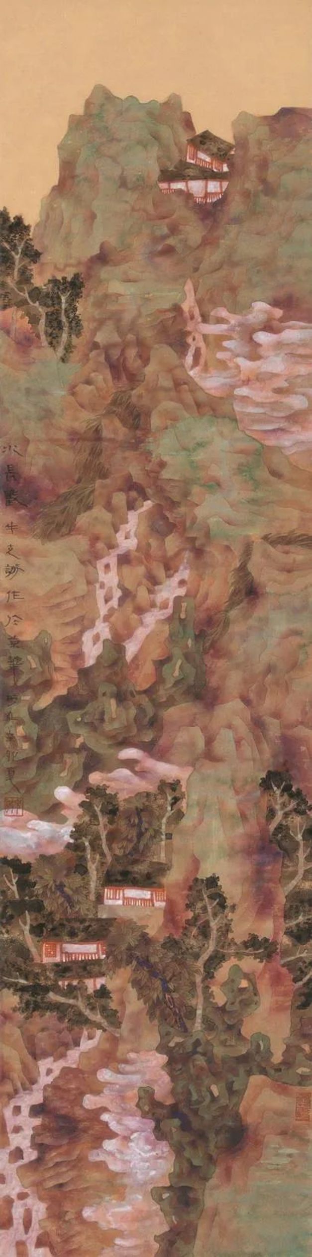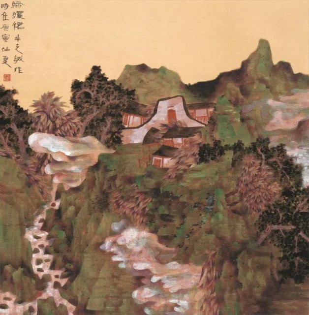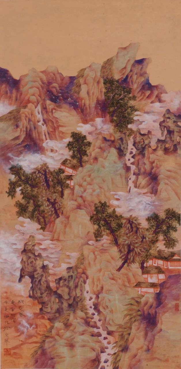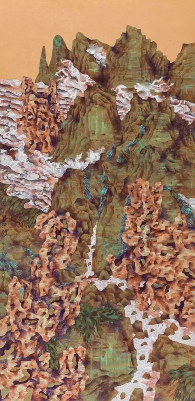 他的创作,以山水为主,结合其对色彩和工笔的研究成果,创造了色墨互融,意蕴高古,形神妙和,诗风浩荡的风格。其画风,既不同于晋唐传统工笔青绿的固有色系和用笔方式,亦有别于西方环境色系和构成形式,可圈可点之处,不一而足。