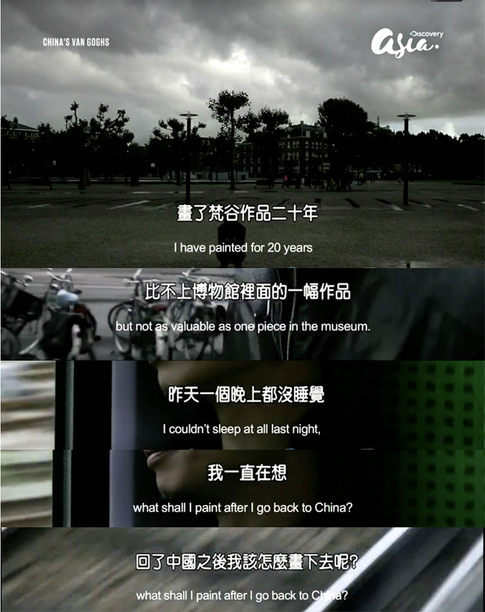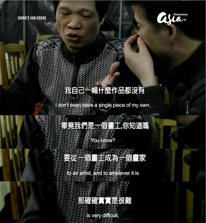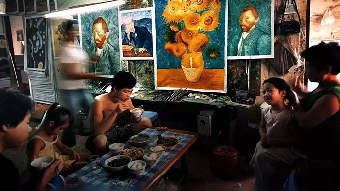 当然,以复制世界名画起家的村落,必定不能少了梵高的作品,纪录片《中国梵高》真实再现了大芬村油画工们复制梵高经典作品的日常过程。影片从2007年拍摄、制作,直到2016年在荷兰首映,历时近10年之久,记录了赵小勇、周永久等大芬村画工们生活、工作的真实场景。