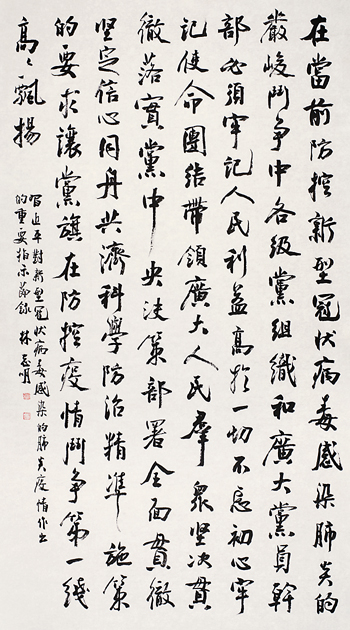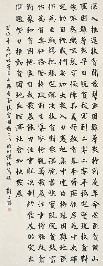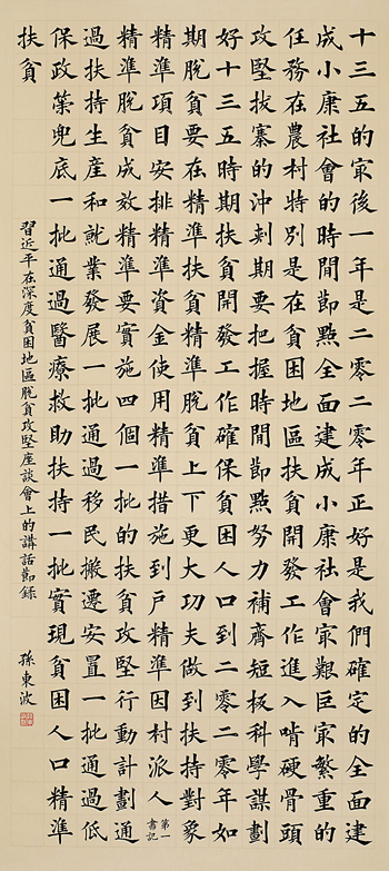 “以展览带动研究,以研究深化展览”是当前书法展深掘主题的思路模式。于重大题材而言,则对创作的严谨性、严肃性有更高要求,须考量时代思想、文化体验、学术转化等要素,打造彰显时代精神和中国精神的精品工程,进而形成更为广泛的社会价值认同,为脱贫攻坚助力,为民族进步铸魂。