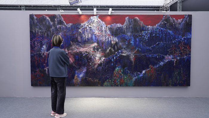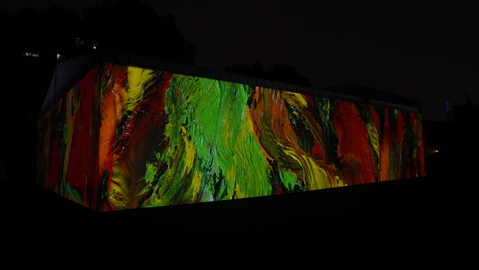 在本次展览中艺术家周思源的作品展现了传统架上绘画与科学技术手段交融实现的跨界尝试。其中名为《蜀道》的mapping投影和纱幕投影,以油画为创作素材通过投影的叠加突破了时间和空间的限制。一方面,突出了山的伟岸、格局和意象;另一方面,数字图像的再造实现了从平面到三维空间的提升。同时呈现了油画本身对山体肌理的厚重与稳固地塑造以及山这个主体的色彩或雄浑或富丽或内敛或清爽。数字影像中流淌的笔触还原着艺术家创作时的心境,宛如壮丽的交响乐奏鸣曲,为观者提供一种层次分明的体验。