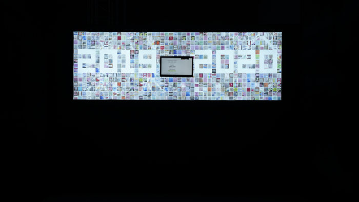 田野现场展出的是一个结合了影像与装置的作品《2019-2020》。严格意义上说这是一件互联网艺术作品,在新冠肺炎席卷全球之际,众多艺术家都在积极地思考关于生命、社会、疾病等主题的创作。田野作为教育者首先通过互联网发起了一场艺术活动,面对回到全国各地在家的艺术学院的学生,要求每人带三张当地疫情防控期间的出门条或通行卡拍摄成照片和图像返回给艺术家进行整理;回到艺术现场,该作品包括了搜集的物件图像的呈现和影像装置两部分,其中影像展现了worldmeter网站全球实时更新的新冠感染、死亡与治愈数据,为艺术家参与社会公共事件提供有效地佐证。