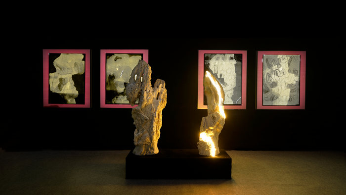 毕业于中国美院艺术现象学与实践方向的林印吉博士创作了《揽星》系列的灯光装置作品。诚如艺术家的诠释“我为了生命中的星光而活,人们却说那是在浪费时间。”整组灯光装置呈现出中国艺术审美精神的独特诗性之美。《揽星》试图以最常见的照明手段介入传统的文人题材。石头作为中国传统文人美学的标志性符号,本组装置提供一种新的策略,就像一次对习惯与标准的破坏。同时,也是艺术家对2020年这一特殊年份的思考与对未来的勉励。