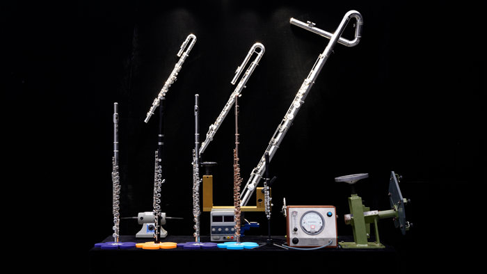 乐器改良家徐静平现场展示《长笛家族与一笛两用》包括了分别使用黑檀木、镍银、纯银、k金打造的短笛、高音木长笛、高音长笛银制、高音长笛10K金、中音长笛、低音长笛、倍低音长笛、一笛两用。
