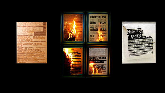 作为本次展览的策展人兼参展艺术家钟舒,带来了一件光雕摄影与声音交互的媒体艺术作品《阅后即焚》。理解该作品有以下关键词:信息、时间、物质与非物质。取名《阅后即焚》旨在表达人对信息的理解和储存方式取决于文字内容的权威性。该件媒体艺术作品包括了声音交互、光雕投影与树脂装置三部分。首先,当人进入展场时触发响应装置,光雕投影随之将文字焚烧的相关内容通过软件进行分屏投影处理,在于传达一种共时性的存在。其次,《阅后即焚》里的火的焚烧与残存的物,是一种非物质(文字)与物质(残留物)的对应,也是表达对文字权威性的肯定。
