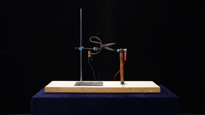 艺术家张晋的装置作品《谈特斯拉先谈锂电池》是一个严肃的呈现科学原理的作品。资料显示Model S 85是特斯拉公司2016年宣布停产的一款汽车,其动力部分由7000多颗锂电池提供。它每跑一小时候需要消耗85度的电能,约等于张晋工作室一个月的耗电量,即平均每一天消耗2.8度电。艺术家通过技术手段让特斯拉线圈产生的高压电击穿空气产生电弧把音频信号转换成物理意义上的声音。