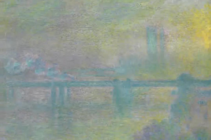 我们根据画面的细节,再根据潮汐的变化,根据太阳在空中运行的轨迹及当时所描绘的气象,以及画面左边的烟囱中烟的方向等,最终确定了创作时间和地点。”