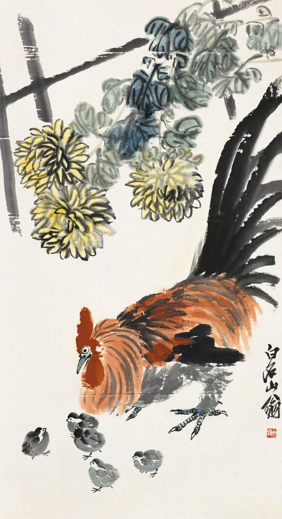 齐白石 群鸡菊花 纸本设色 纵97厘米 横52厘米 北京画院藏