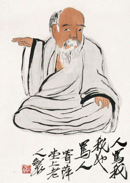 齐白石画过一幅很有名的小品,画上一老者跏趺坐,右手戟其二指指向画外,瞪目作气咻咻状,题有七个字: