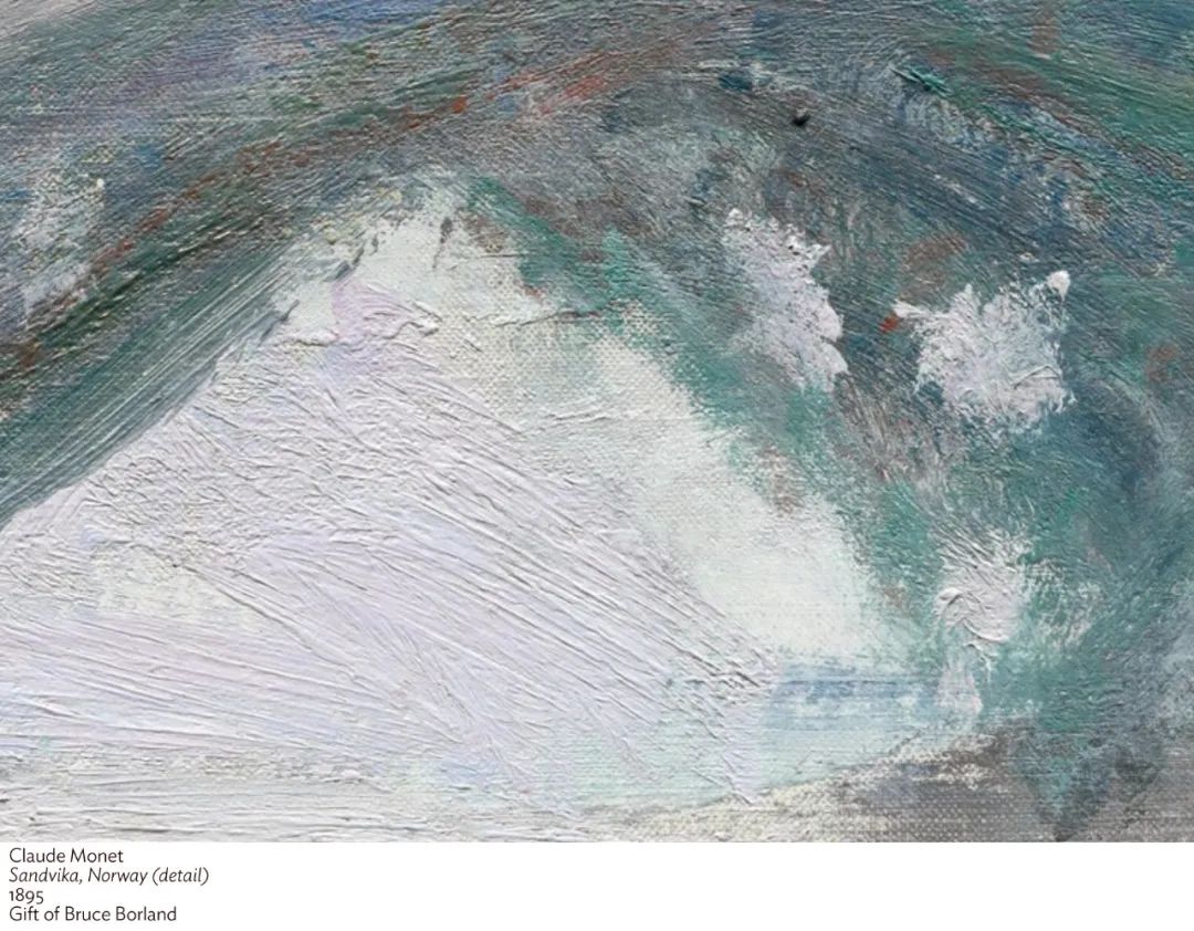 芝加哥艺术博物馆馆藏的这幅《桑维卡》,其复杂纹理的表面是莫奈多次创作的结果,这也是莫奈在不同阶段应用干湿结合画法的证据。色彩丰富的几笔,例如画面中的蓝色和玫瑰色,是最后加到画布上的。莫奈经常把画带回工作室后,再添上几笔来收尾。