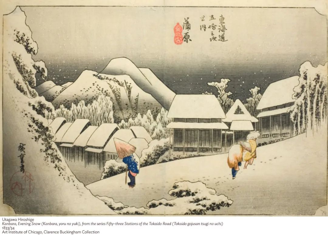 桑维卡系列和歌川广重的作品,例如《蒲原夜之雪》和《龟户神社在雪中》构图上有相似处: