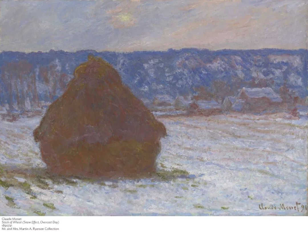 “我已经准备好画布了,天气允许的话,我也知道一天各个时候到哪儿画画最好。但是有些阴天可见的地方,晴天时几乎什么也看不见,雪太刺眼了。1891年2月24日,莫奈写给爱丽丝。”