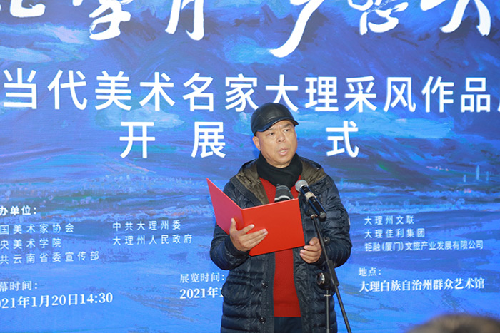 展览开幕仪式由大理州委副书记、州政府州长杨国宗主持,州委书记陈坚、云南省美术家协会主席、云南美术馆馆长、云南画院院长罗江先生代表中国美术家协会分党组书记、驻会副主席徐里分别致贺词。