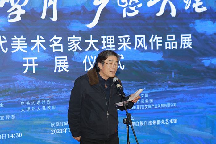 云南省美术家协会主席、云南美术馆馆长、云南画院院长罗江先生代表中国美术家协会分党组书记、驻会副主席徐里在致辞中表示,风花雪月是大理美丽独特的自然风景,也是我们坚定文化自信、留住青山绿水的美好心愿。希望通过此次展览能够增加人们对大理美好风物的了解,同时唤起更多艺术家推出一批有时代气息、有灵魂温度的精品力作,延续历史文脉,留存属于中华民族精神的乡愁记忆。
