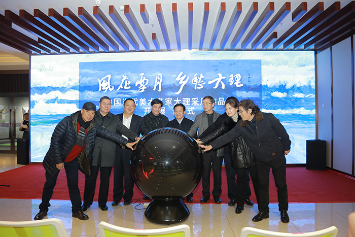 最后,出席本次活动的嘉宾们集体上台共同触摸感应球启动“风花雪月、乡愁大理——中国当代美术名家大理采风作品展”开幕。