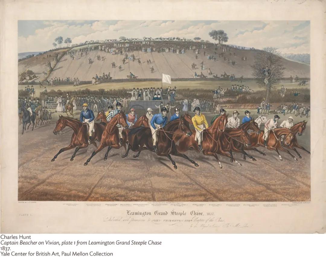 赛马原是一项标准的英国运动,到十九世纪初期得到广泛普及。这项运动不仅令人兴奋愉悦,而且这种英式博彩更让观众情绪激昂。阔绰的东家会委约画家为自己的冠军赛马和骑手画像;如果是大赛,商家把这些画像复制成彩色铜版画,供不应求。