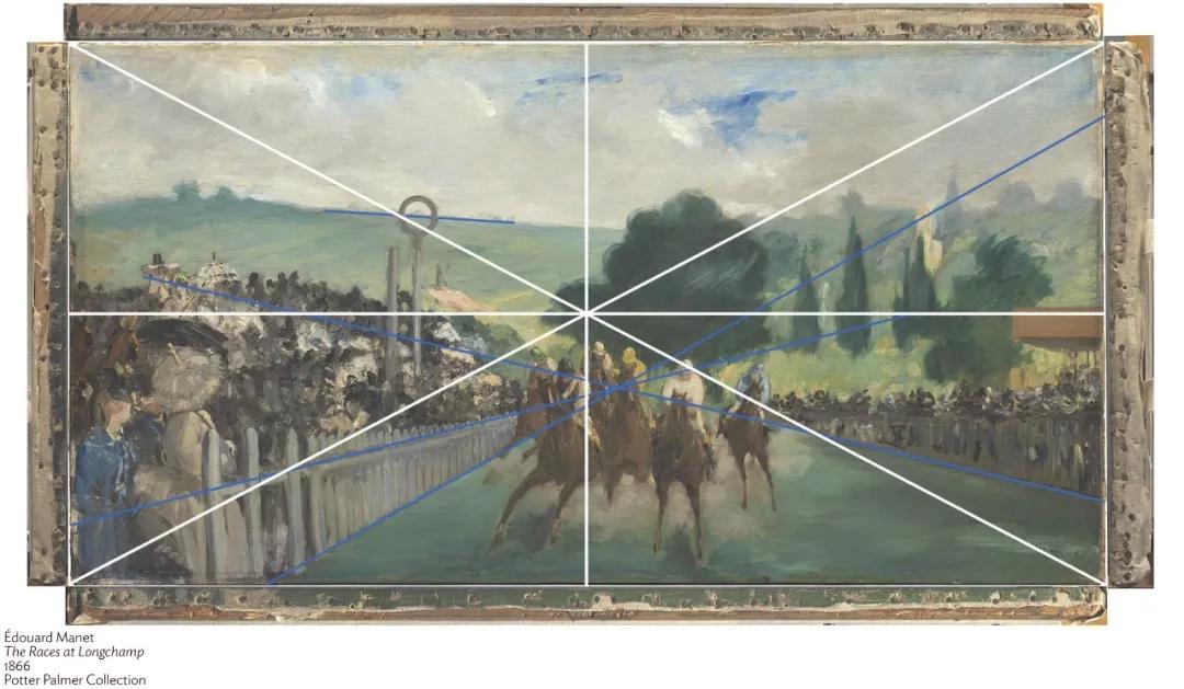 当马奈于 1866 年创作这幅画时,它在各方面都非常前卫,马奈没有选择惯常的人群视角,而是独辟蹊径选择了一个更加大胆的视角,让观众正对赛道。骑手们骑着赛马冲过终点线的柱子,并且向着我们继续奔驰,仿佛可以听到如雷的马蹄声动地而来。