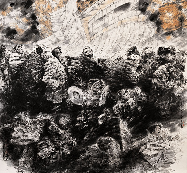 创作于20世纪80年代的《母亲》,是他超越上世纪50年代至70年代创作的《粒粒皆辛苦》《说红书》《艳阳天》插图的高峰作品。当时他一方面推动了首届中国上海双年展的成功落地,一方面又回归传统经典艺术,创作了一系列纯粹的、完全以金石书法线条创作的古典人物画作品和西藏题材人物画作品,但这批作品并未得到评论界应有的重视。在我看来,这正是方增先老师的创作进入第三阶段,即他个人最高境界的艺术状态。到了新世纪,从作品《家乡板凳龙》到《祭天》,我认为他已经超越了为时代而艺术、为艺术而艺术,进入到为人性或艺术家性灵的艺术阶段。在这个阶段中,他用狂草大写意、极为奔放的技艺来表达他对艺术理想境界的追求,我把它看作是艺术家心灵或者是性灵释放的“大写意巅峰之作”。