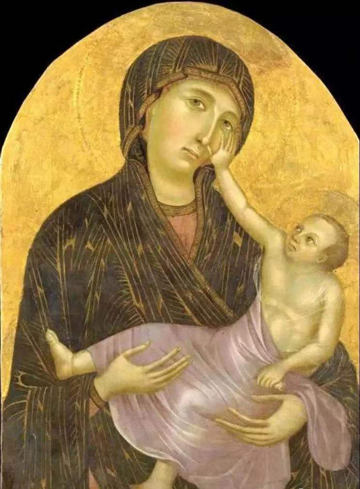 基督教中的圣母画奠定了早期母亲形象的基调,随着欧洲13世纪基督教圣母崇拜的兴起,宗教画中圣母题材的绘画作品也逐渐增多,圣母甚至有时取代了画面中基督的主体位置。在基督教中,圣母不仅是耶稣基督的母亲,也是圣洁与庄严的象征。中世纪的圣母题材绘画分为两种,一是圣母向信徒展示怀中的圣子,二是通过描绘基督受难来表现圣母的悲怆,但两种题材中的圣母表情都让人捉摸不透,怀抱着圣子的圣母经常一副爱谁谁的样子,就连基督下十字架后圣母的表情,也让我们难看出她究竟是哭是笑,要说基督教是通过圣母对圣子的怜爱来触动观众的内心有些牵强,这一时期的圣母更多的作为信徒连接上帝的符号而存在,多得是程式化,少了一些人性。