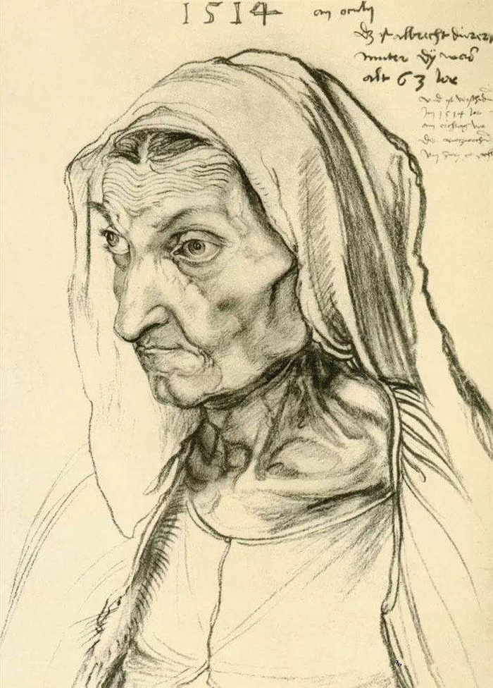 这一时期除了宗教画中的圣母形象,艺术家也通过肖像画来表现生活中的母亲,丢勒在他母亲去世前两个月为其所做的《母亲肖像》,画中的母亲饱经风霜,脸颊凹陷,但披着的头巾下一双眼睛目光如炬,他用写实的手法精炼的概括出母亲脸上岁月的痕迹,将母亲艰辛的一生浓缩在一幅画中。比起将母亲形象永远定格在少女时期的圣母像来说,丢勒的《母亲肖像》有着更具体的人格特征,也更加真实。艺术家通过对现实母亲的描述,肯定了个人的主体地位,也将身为母亲在生活中的挫折与艰辛毫不掩饰的呈现来出来。