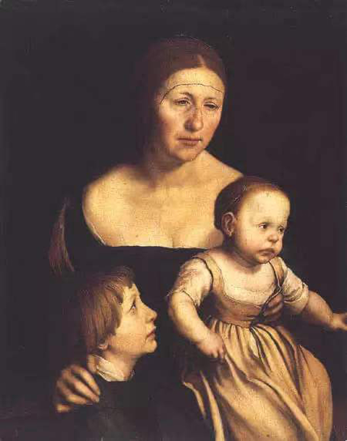 荷尔拜因的《艺术家的妻儿》描绘了荷尔拜因的妻子怀抱两个年幼的孩子,孩子无知的神情加上妻子茫然低垂的眼神,以及画面凝重的色彩,为这一组合添加了一丝庄重和苦涩,既表现出母亲哺育幼孩的幸苦,也反映出艺术家对家庭的眷恋,对妻子的感谢。
