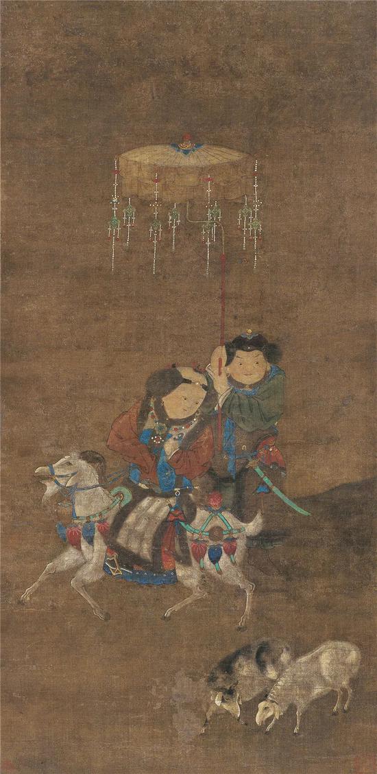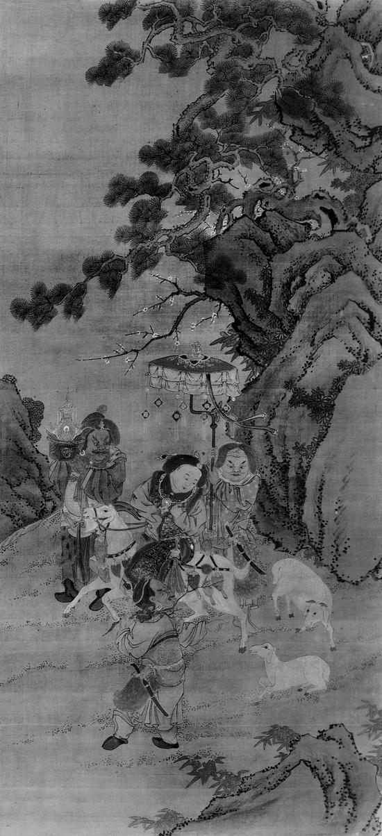 台北“故宫博物院”藏《元人画冬景戏婴图》,立轴,绢本设色,纵126.5厘米,横60.8厘米,无款印,嘉庆御览。画面中四人三羊,画幅中心是一位面貌清秀的童子骑羊,其余三人均为武官装束,胡人样貌,头戴金箍,衣饰皮毛。骑羊童子身后站立的一人,双手举伞幢;与之平行的画面左侧,一武官呈站立姿,双手于头右侧托起一个侈口宝盆,盆壁正面兽首衔环,盆内盛有宝塔、犀角、珊瑚等物,宝塔造型奇特,上部为一座六角顶檐方形亭,檐角上有流苏垂下,亭下主体上绘有全跏趺坐禅定印佛像一尊;骑羊童子正前方描绘一位侧身站立回首胡人,高鼻深目,蓄有长鬈发,胡人特征明显,其右手指向后方,左手握梅枝扛于左肩上,腰间配长弯刀。画面配景为山石、松、竹、梅。
